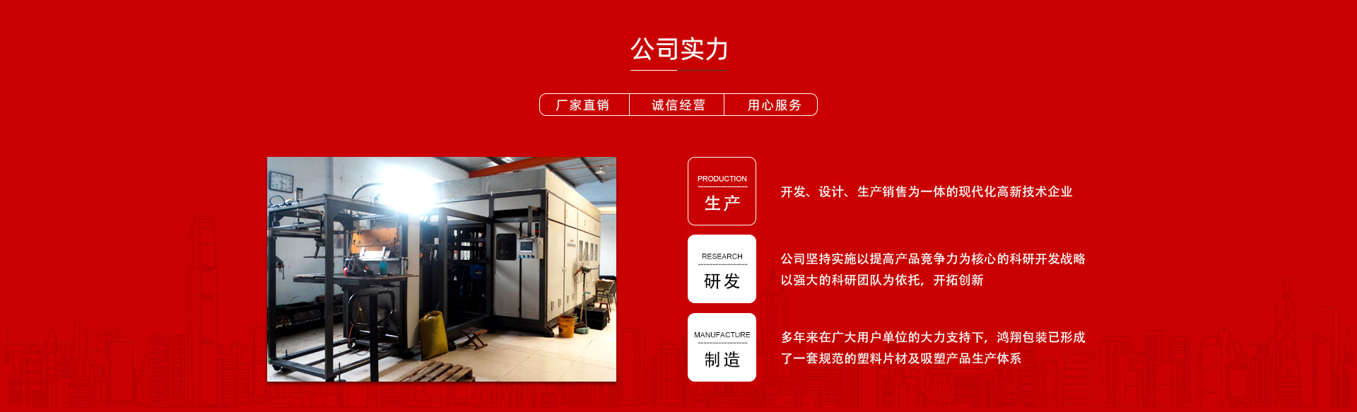 平原縣鴻翔包裝制品有限公司是一家大型生產(chǎn)塑料片材及吸塑產(chǎn)品企業(yè),本公司投資引進(jìn)電腦自動塑料氣壓成型機,壓片機,全自動高速吸塑機,率先開發(fā)生產(chǎn)PVC片材,PET片材,PS片材,PP片材等,鴻翔是國內(nèi)先進(jìn)的生產(chǎn)廠家之一。本公司產(chǎn)品廣泛應(yīng)用于醫(yī)藥、食品、化妝品、日用品、農(nóng)業(yè)、五金、電子元件、工藝品等行業(yè),也可根據(jù)客戶需求自行設(shè)計制作模具。本公司技術(shù)力量雄厚,生產(chǎn)設(shè)備工藝先進(jìn)。我們秉承用戶至上的經(jīng)營宗旨,竭誠為您服務(wù)。